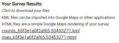 The .html file can be saved and opened in your browser to see a Google Map representation of your survey. Save it somewhere handy for a quick view of your perimeter shape. A small version is shown on your results page for clarity.